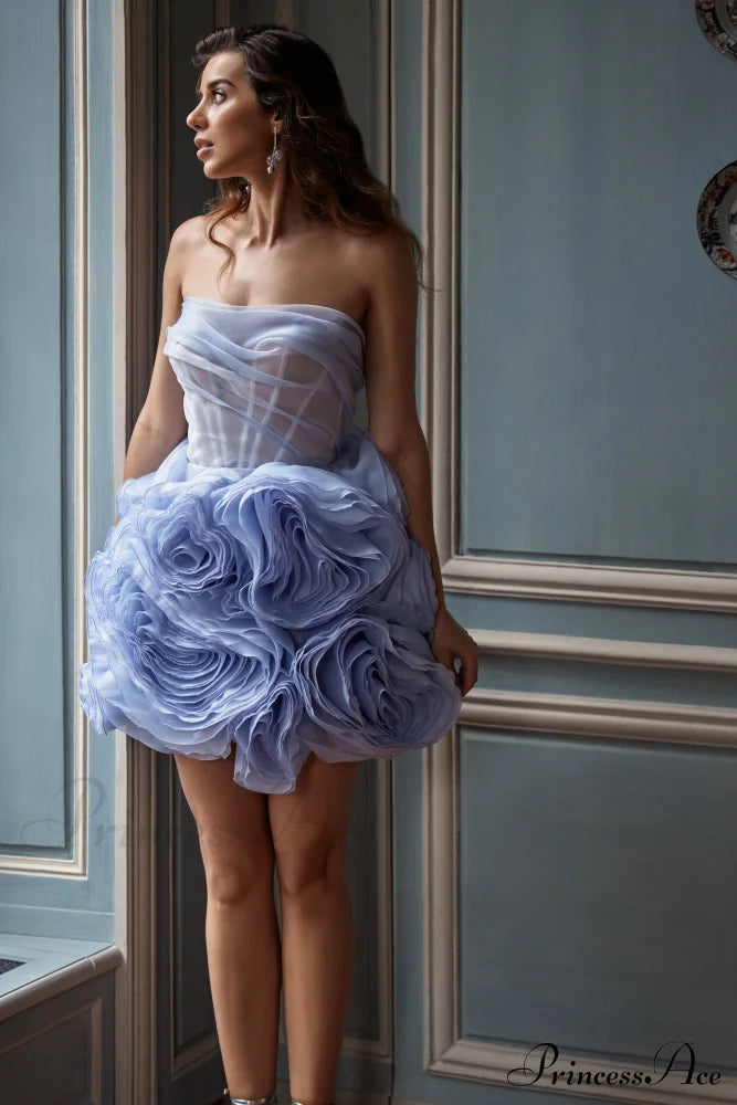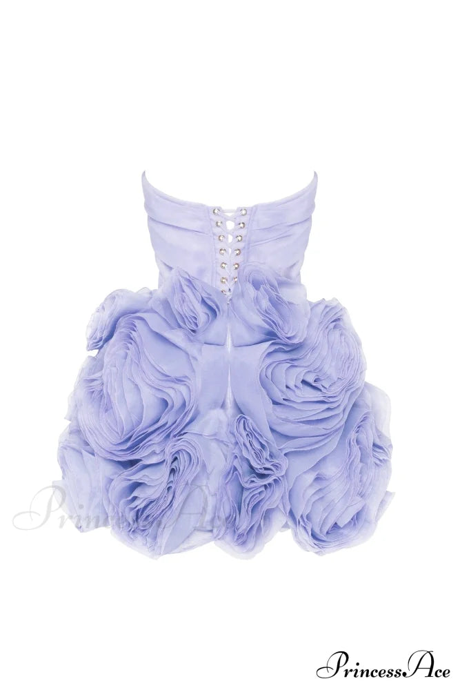 Lavander mini dress, made from lustrous organza, it's appliquéd with oversized organza roses on the skirt. Features a semi-transparent bodice decorated with tulle fabric on the neckline and lace-up closure.