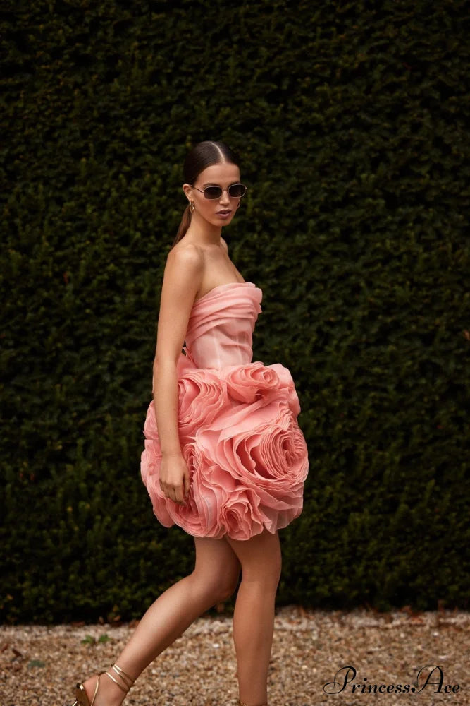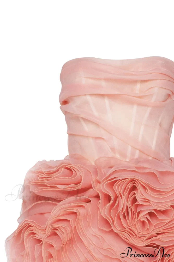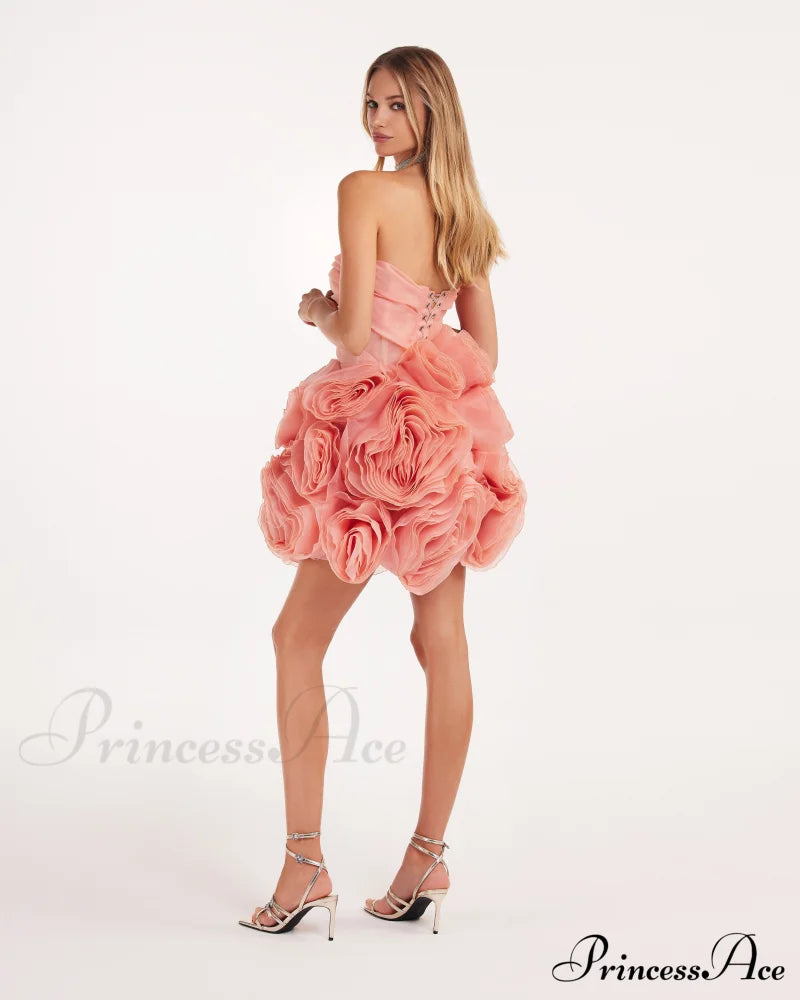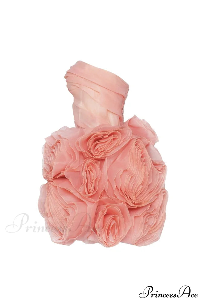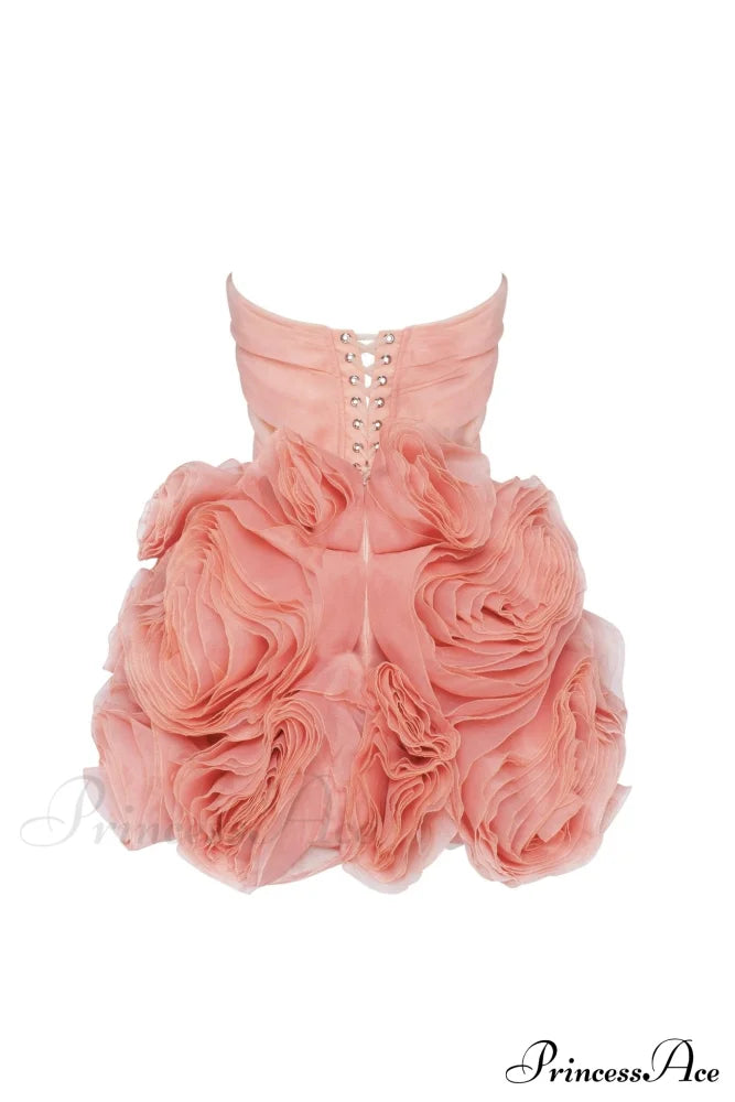 Coral mini dress, made from lustrous organza, it's appliquéd with oversized organza roses on the skirt. Features a semi-transparent bodice decorated with tulle fabric on the neckline and lace-up closure.