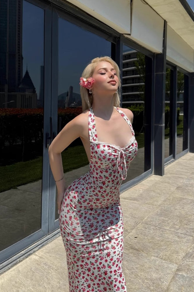 Floral Tie-Back Backless Fitted Split Maxi Dress