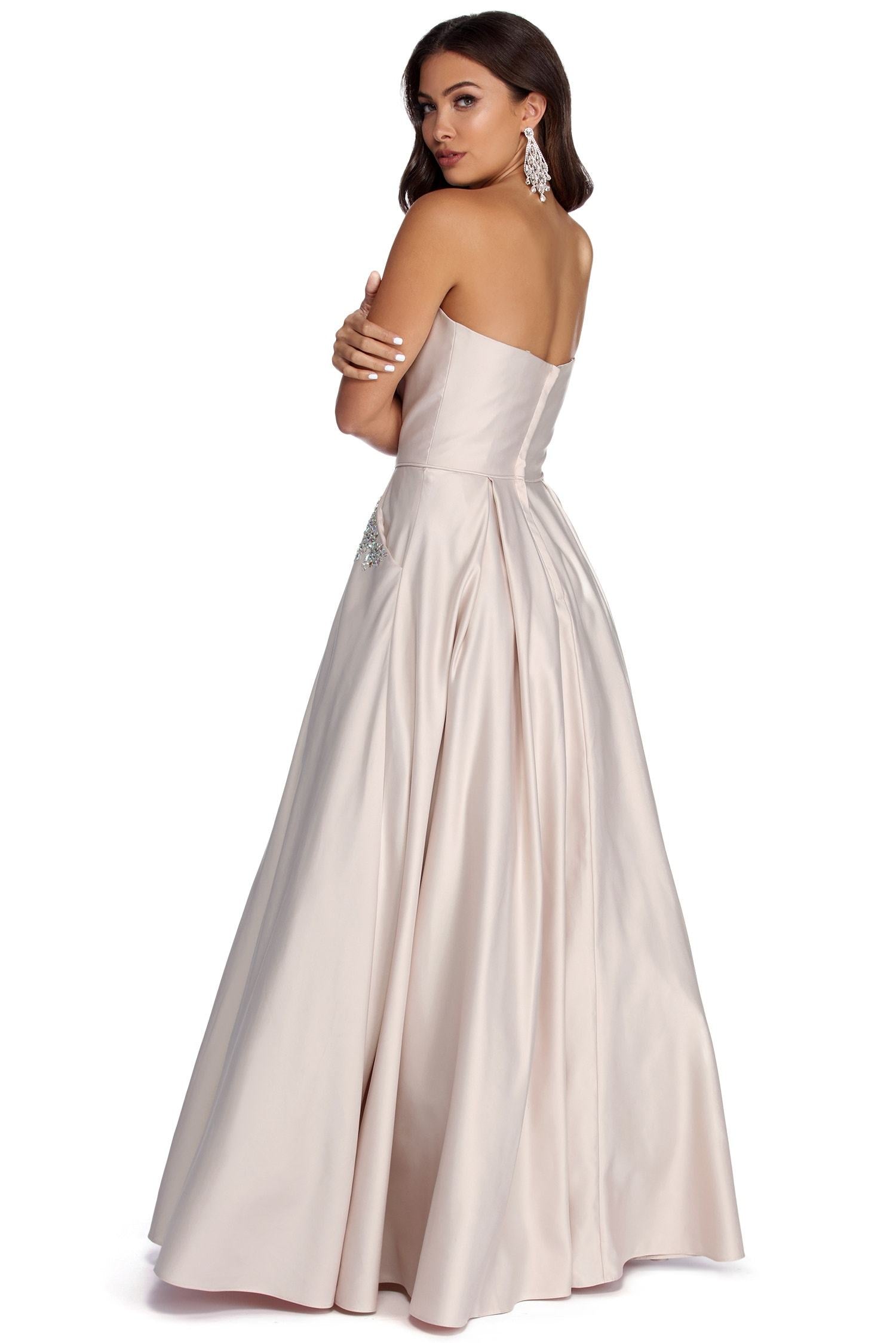 Shine like the rare gem you are in our one of a kind Josephine dress! She features an all over beige hue. a sleeveless bodice. a sweetheart neckline with a silicone no-slip strip. padded cups. built in boningand princess seams. Her slim fit bodice leads to avoluminous ball gownsilhouette with hidden side pockets adorned with sparkling gemstone details. She is composed of a textured satin-like fabric that offers a form hugging fit with minimal stretch. Dress is lined and includes a back zipper closure and petticoat.