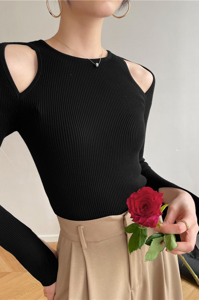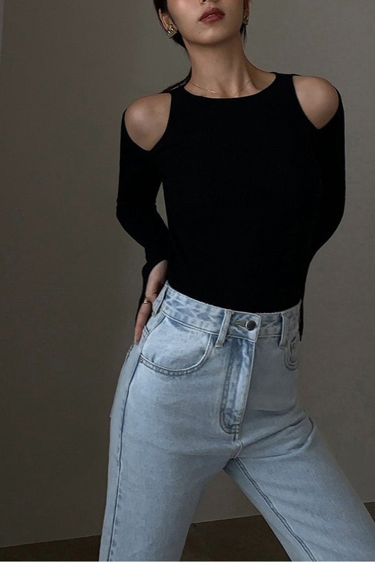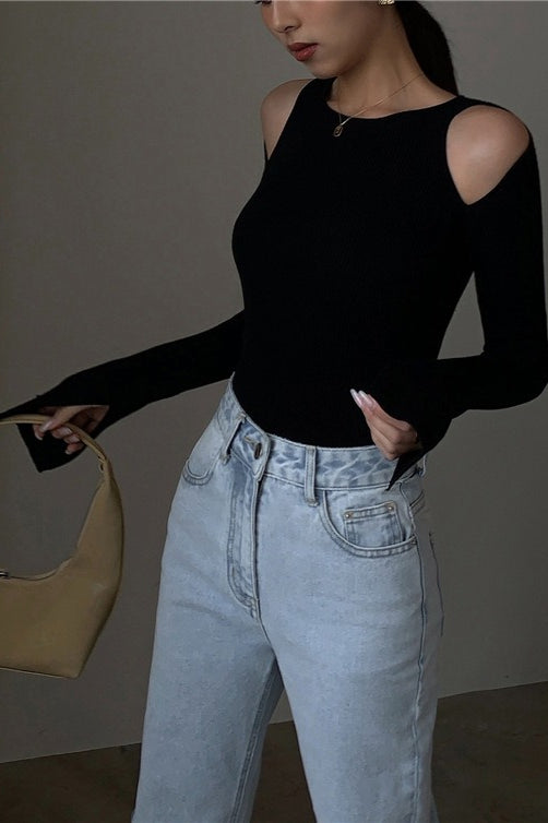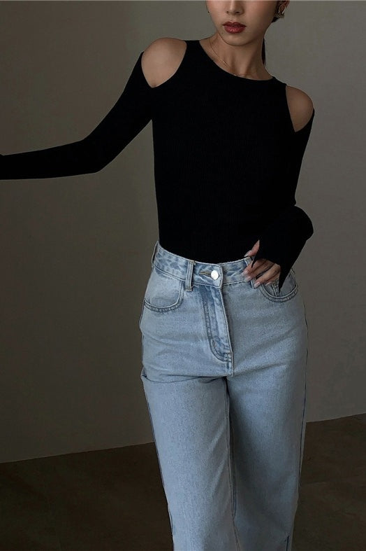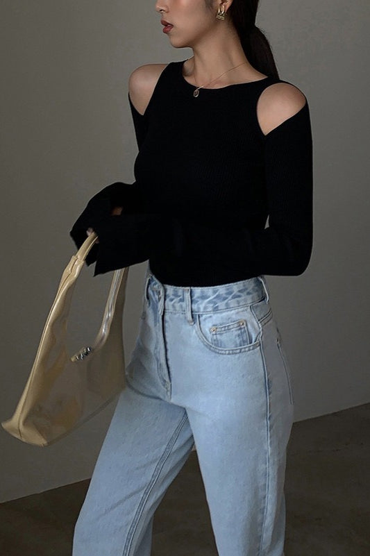 Retro Crew Neck Off-Shoulder Split-Cuff Slim Knit Top